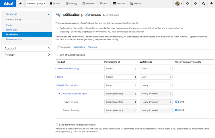 Configuration For each product, you can set email preferences based on whether you are “watching” or “participating.” Watching means you have been added as a watcher on that record. Participating means you are assigned the record in Aha!
