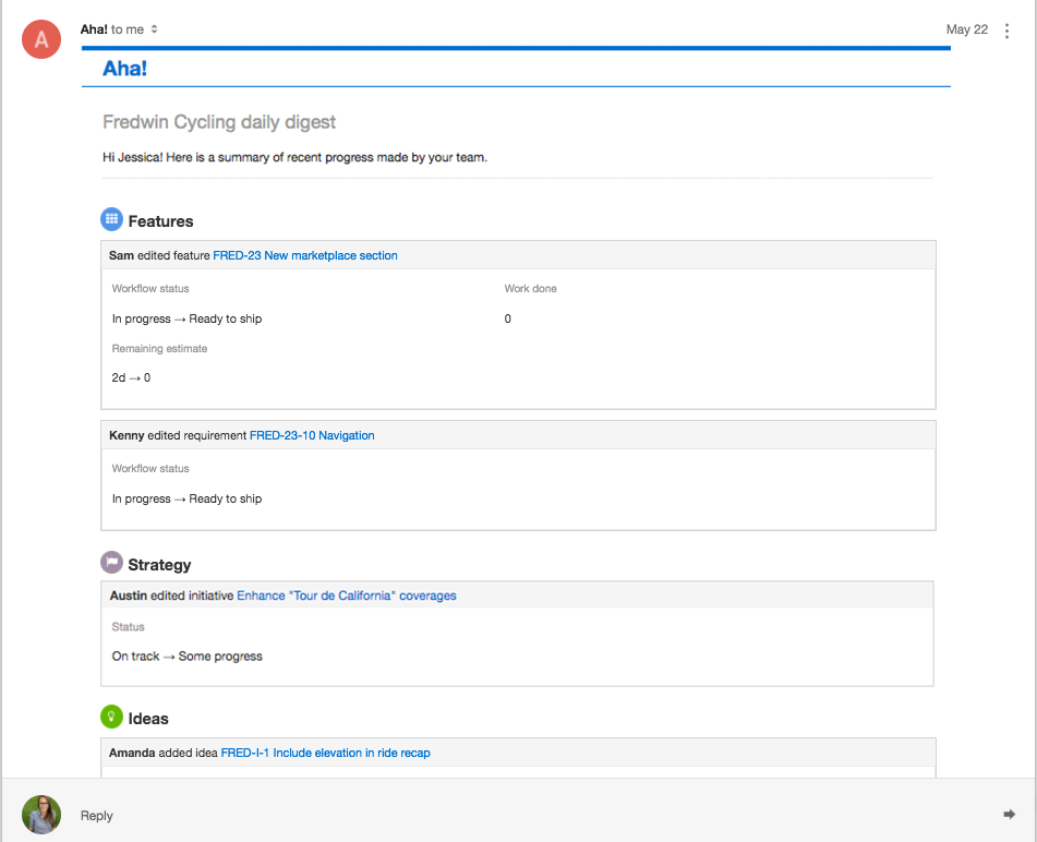 Daily digest Maintain strategic alignment without cluttering your inbox by receiving a daily recap of what changed by product. Depending on your level of involvement, you can use this email notification to keep tabs on your product or to stay close to what is happening in other products across the portfolio.