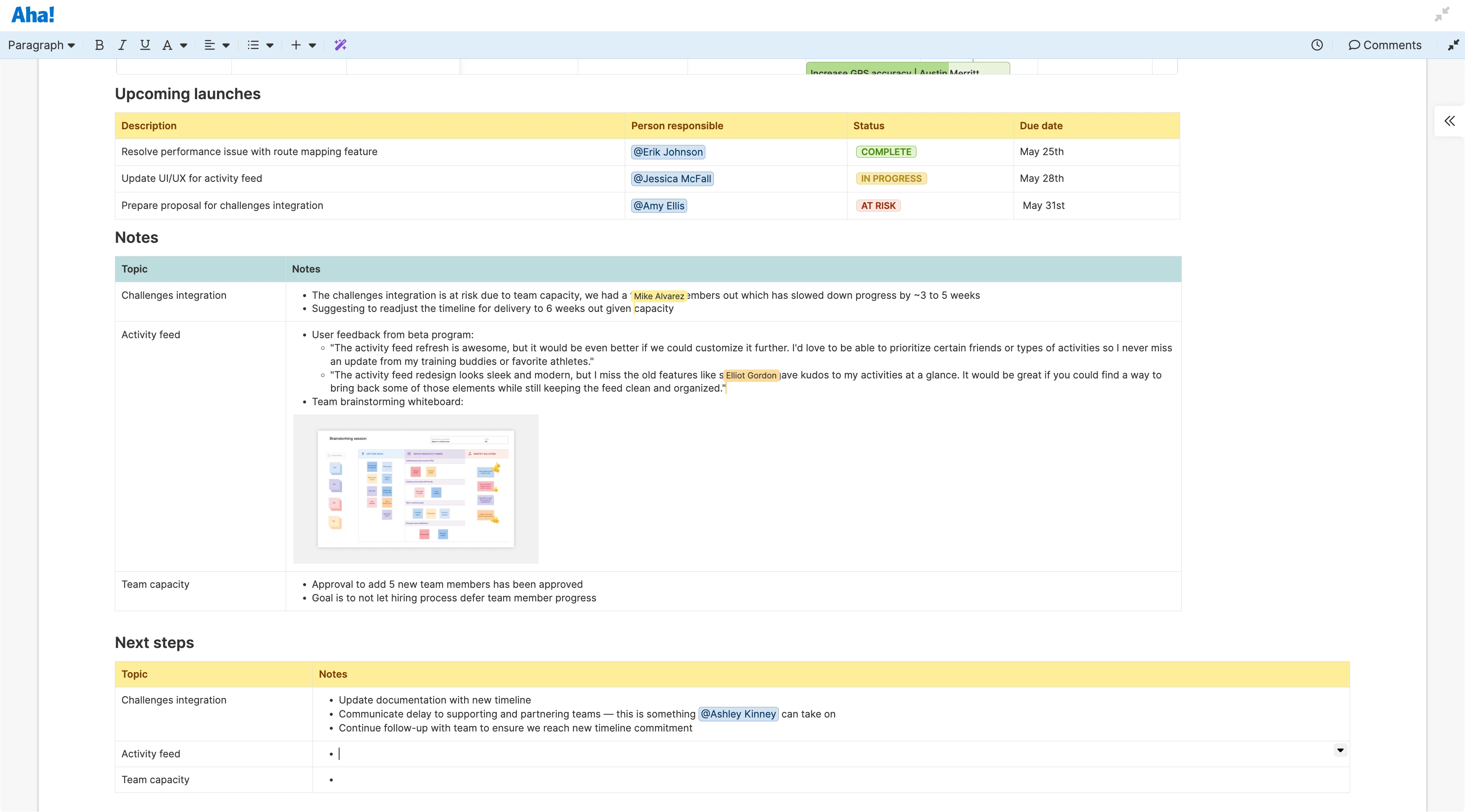 Use the same rich formatting options and AI assistant that are part of the Aha! text editor to build a compelling agenda. If you use meeting documents as part of another product in the Aha! suite, you can also embed live views of your data and whiteboards to enrich your discussions.