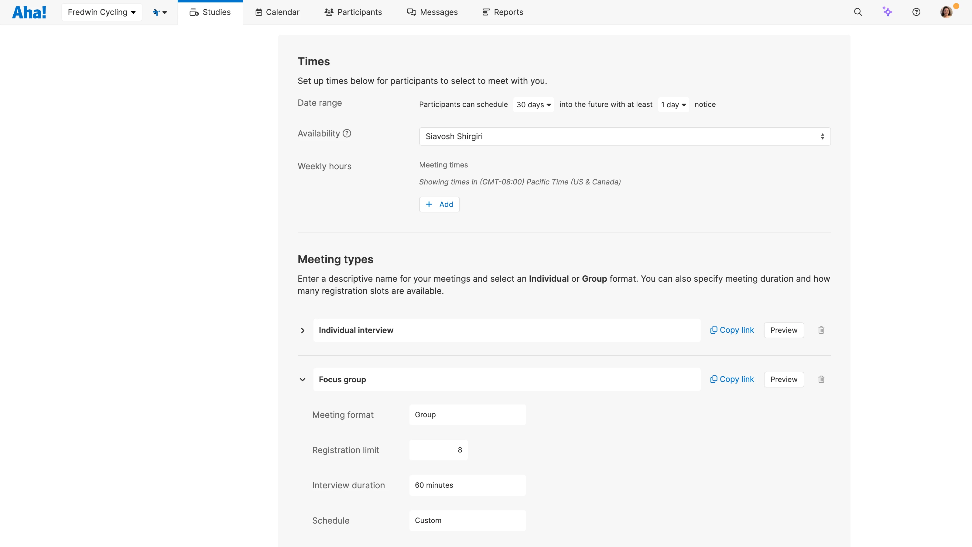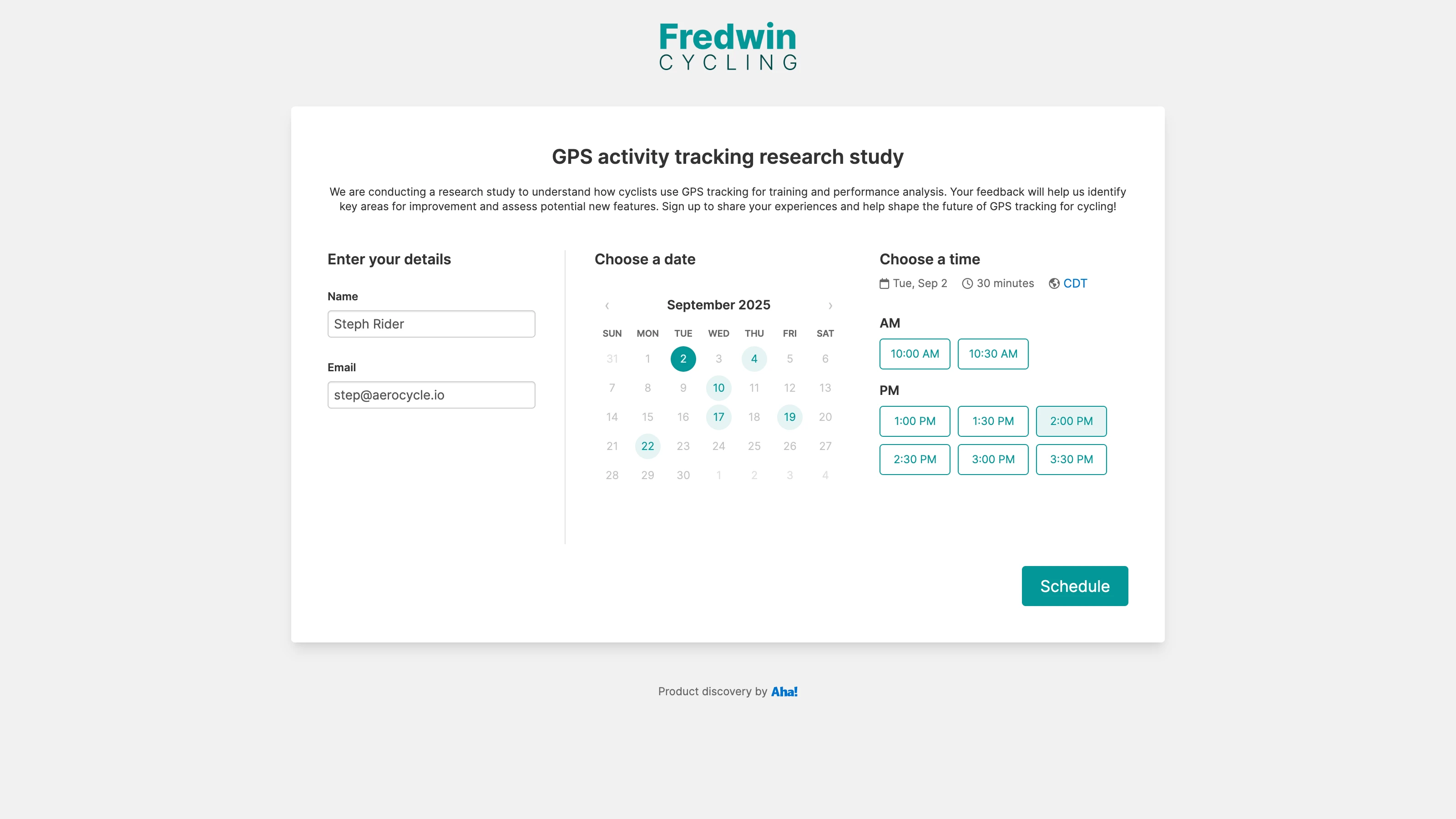 Product managers, researchers, and UX teams all need to talk to customers. But managing the logistics can be a pain. Aha! Discovery brings structure to the outreach process — you can source participants directly from your ideas portal or Salesforce instance, maintain a central participant database, and invite people to choose a time that works for them. You can even set your meeting location automatically with a Microsoft Teams or Zoom link.
