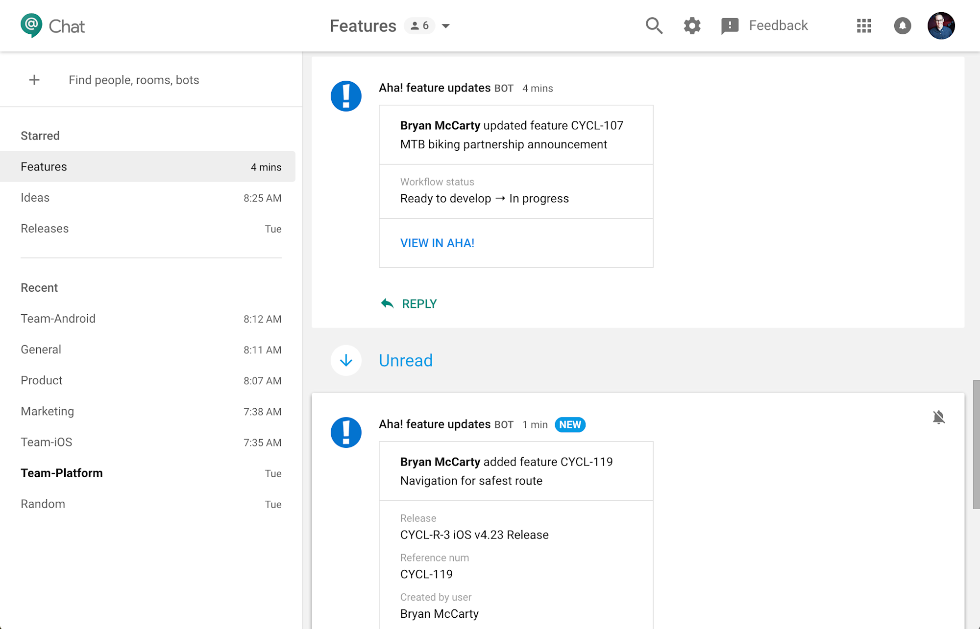 Track progress on features Share updates to features by creating a specific “Features” room in Hangouts Chat. This is helpful for team members who are interested in following new features added in Aha! and seeing what changes are being made. Need more detail? Click the link to view the feature in Aha! from the chat. (You must have viewer permissions to the related product to open the linked record.)