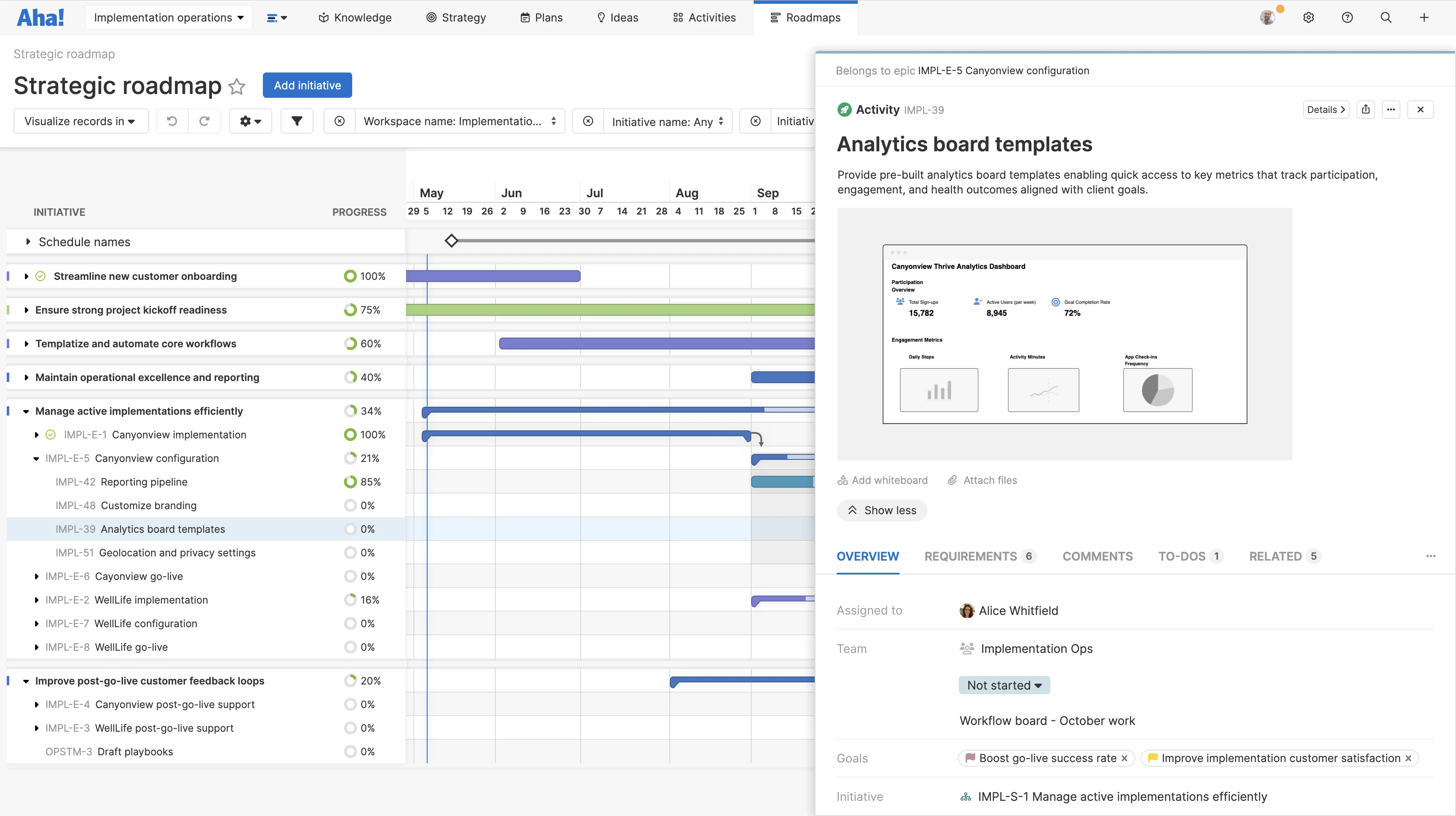 The Strategic work column shows all activities and requirements assigned to the team from Aha! Roadmaps.