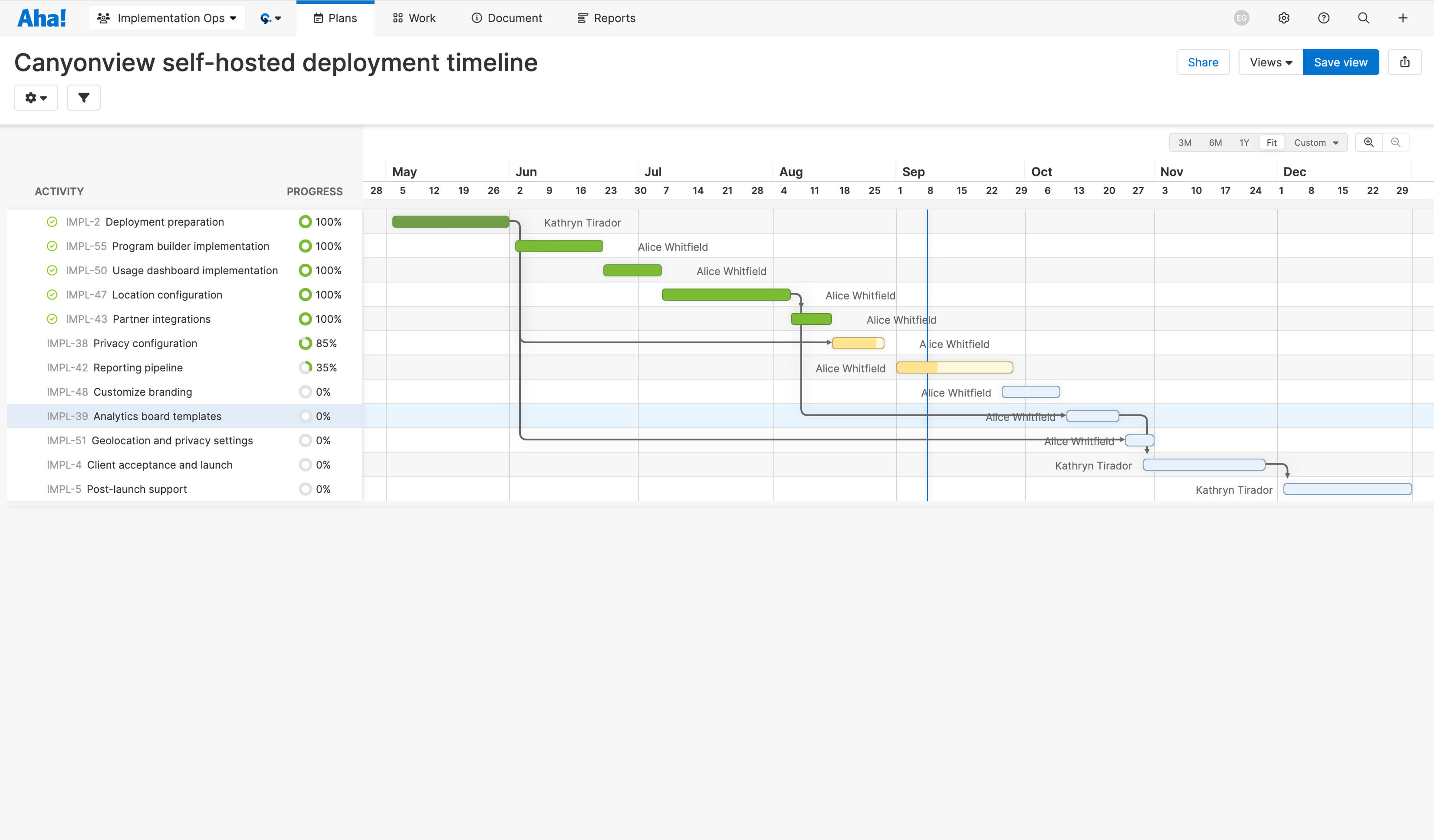 Once priorities are set, timing matters. Use the timeline view in Aha! Teamwork to lay out all activities by start and end date. Adjust dependencies, shift durations, and see how each piece fits into the broader plan. This gives everyone a clear picture of what is happening and when — so nothing gets missed and deadlines stay realistic.