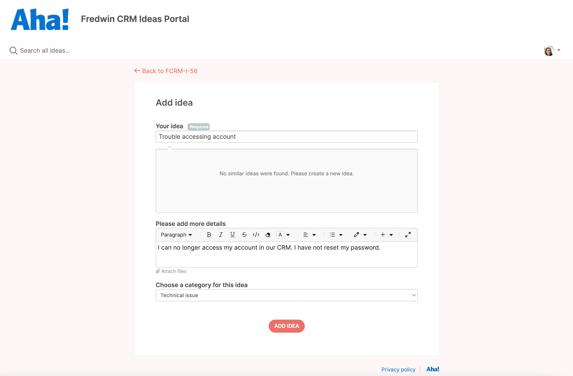In our example, the fictitious company, Fredwin Software, uses a private ideas portal to capture employee requests for internal tools — such as their CRM, order management, and business intelligence systems. Some of those requests are enhancements that need to be prioritized on the roadmap. Others are technical issues that need to go straight to engineering — such as updating user permissions or bug fixes. In the example below, when a user submits a request they are required to select a category — enhancement or technical issue — so we can route feedback to the correct team.