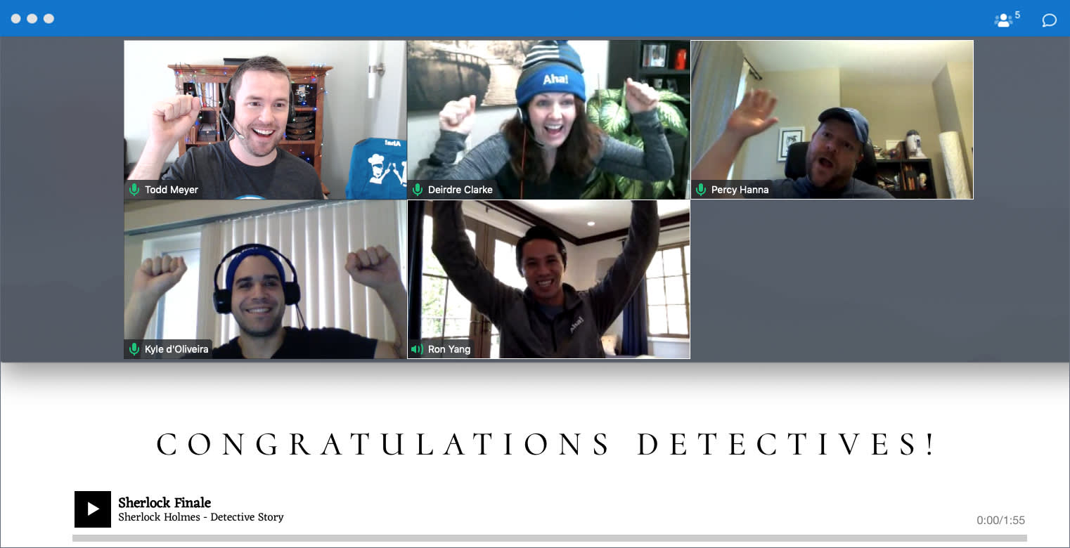 A group of Aha! detectives celebrate cracking the case as part of a virtual game.