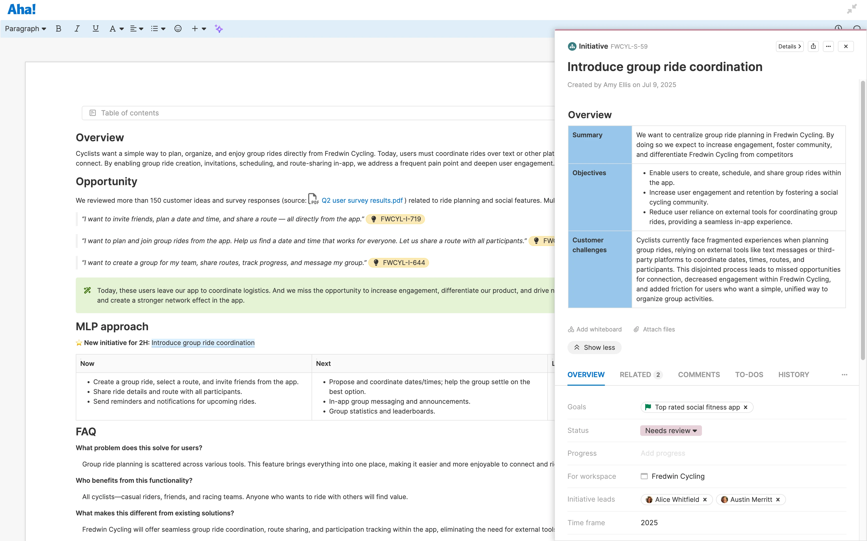 Once there is agreement on the direction, we can move from documenting ideas to creating actual work. We highlight text in the business case to create new initiatives and features, or link to existing records — all without leaving the document.