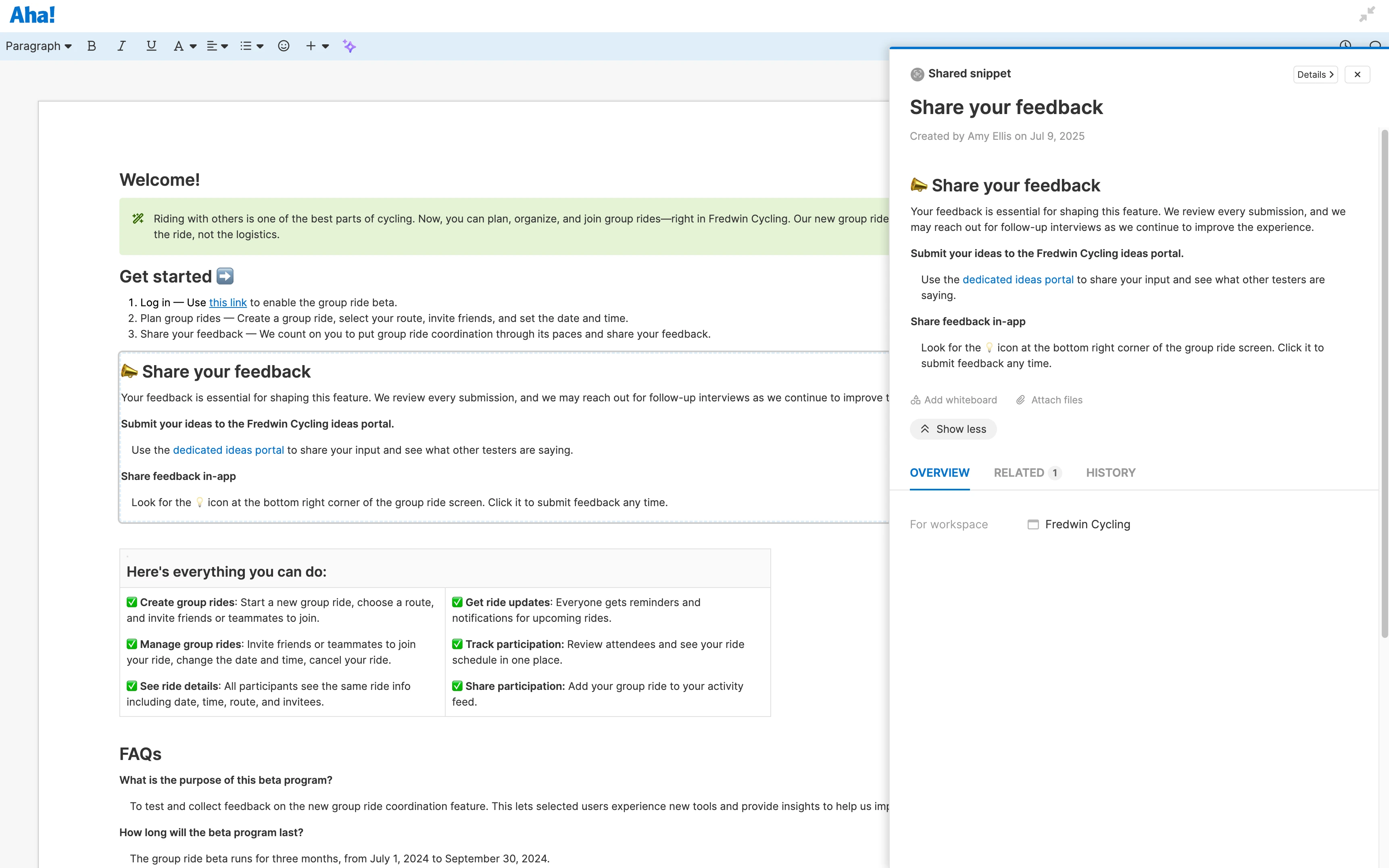 Insert snippets to reuse standard content across multiple documents (available in Aha! Knowledge Advanced).