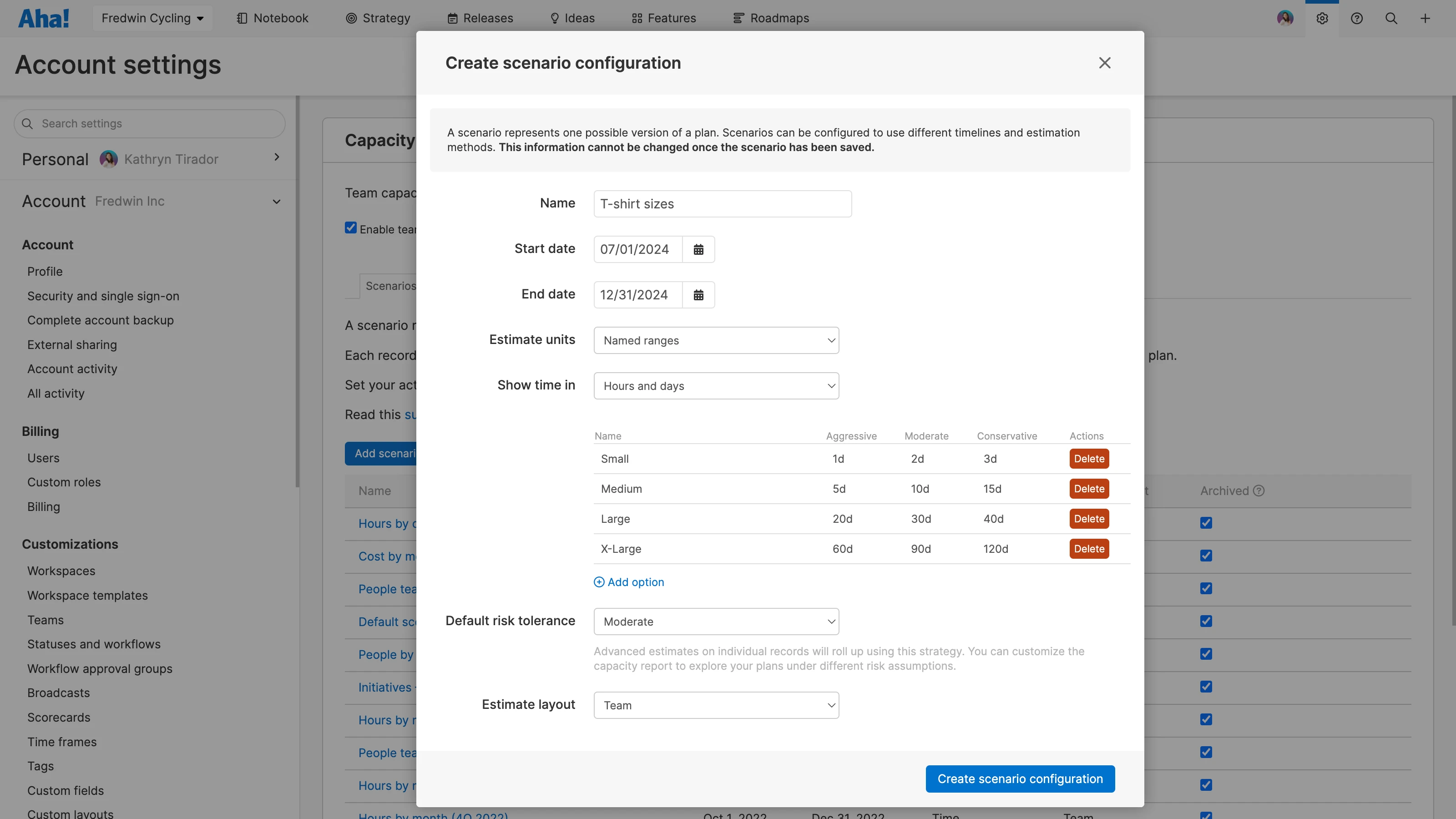Imagine you are defining new features for your roadmap. You want to assess the high-level effort involved to make sure the team has enough capacity to deliver the plan. Here, we created a new scenario and used T-shirt sizes with four different size options. We added conservative, moderate, and aggressive time estimates for each, set the default risk tolerance, and created the scenario.