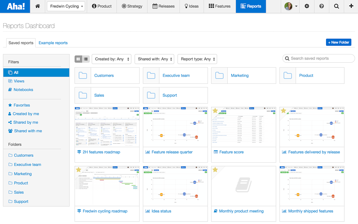 Instantly find your favorite reports “Favorite” your most-used reports so you can spend less time looking for roadmaps and views — and more time making better prioritization decisions. Select the star icon on each report thumbnail to add a report to your favorites list. You can also search and filter using the “Created by,” “Shared with,” and “Report type” drop-downs at the top of the page.