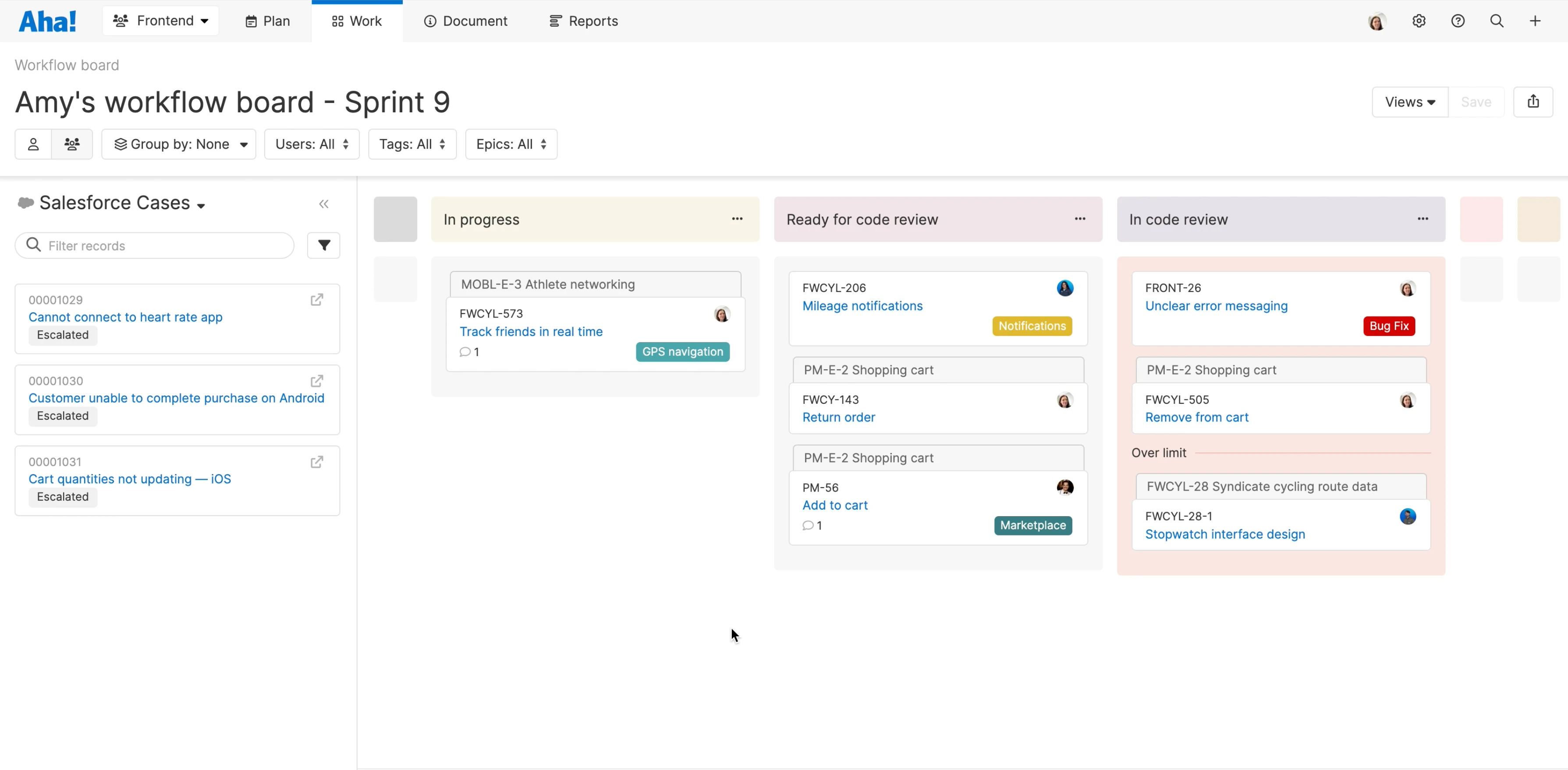 Drag and drop Salesforce cases into your Aha! Develop backlog, sprint, or workflow board.