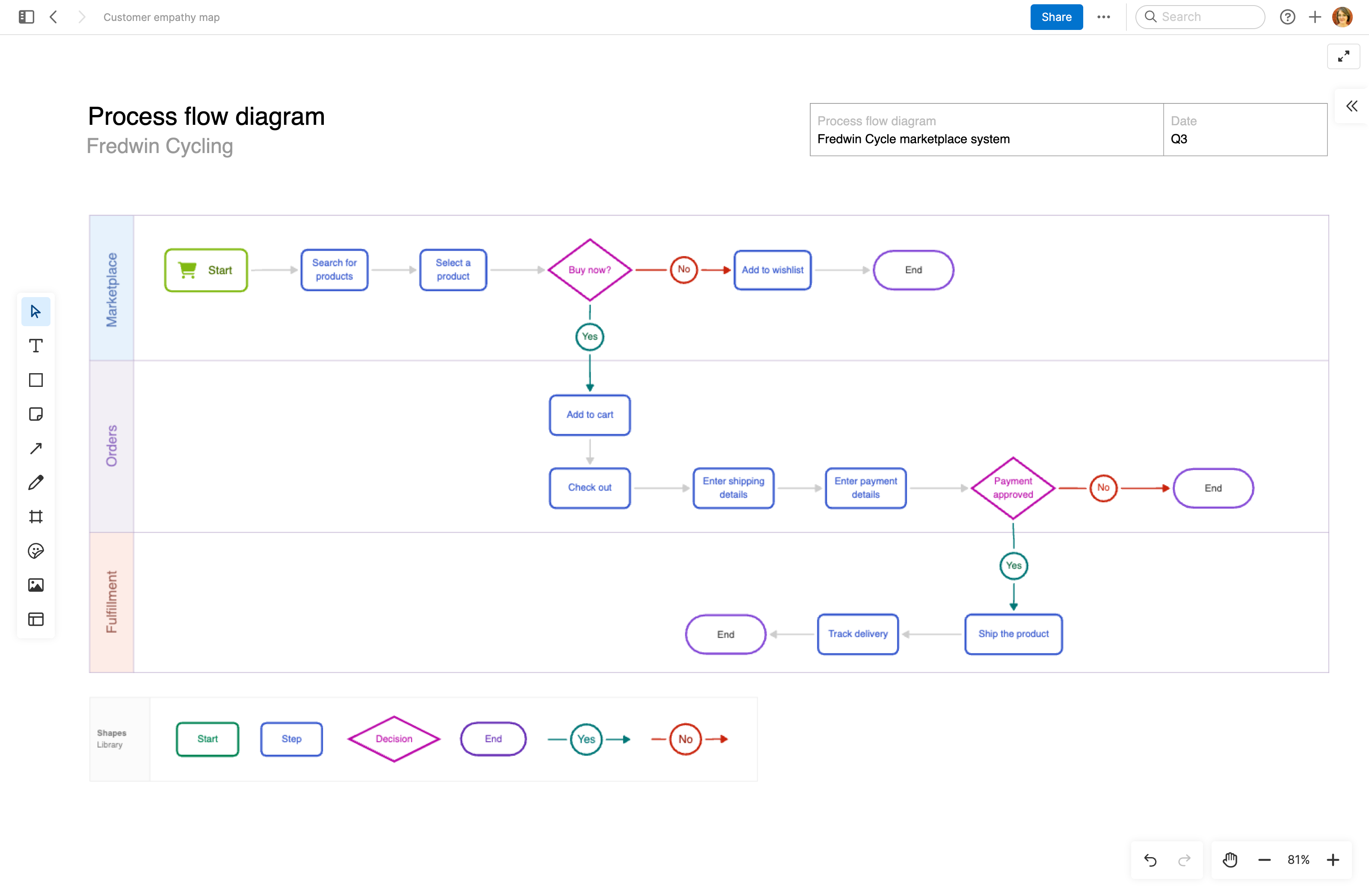 Customize: Tailor the template to match the business process you want to map. Use swimlanes to logically organize key activities.