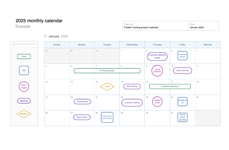 Stay high level: Use shapes and notes to represent work — not manage every detail. This keeps the calendar easy to scan.