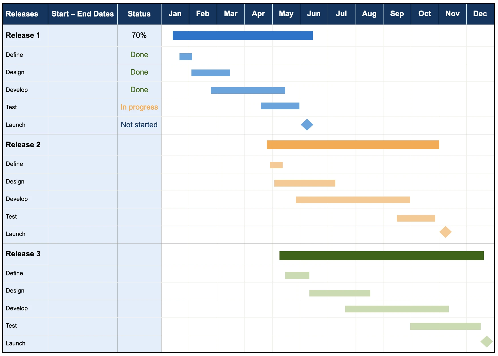 This Excel template is perfect for capturing your annual release plan in one view. You can change the color of the bars to visualize which team is responsible for each phase.