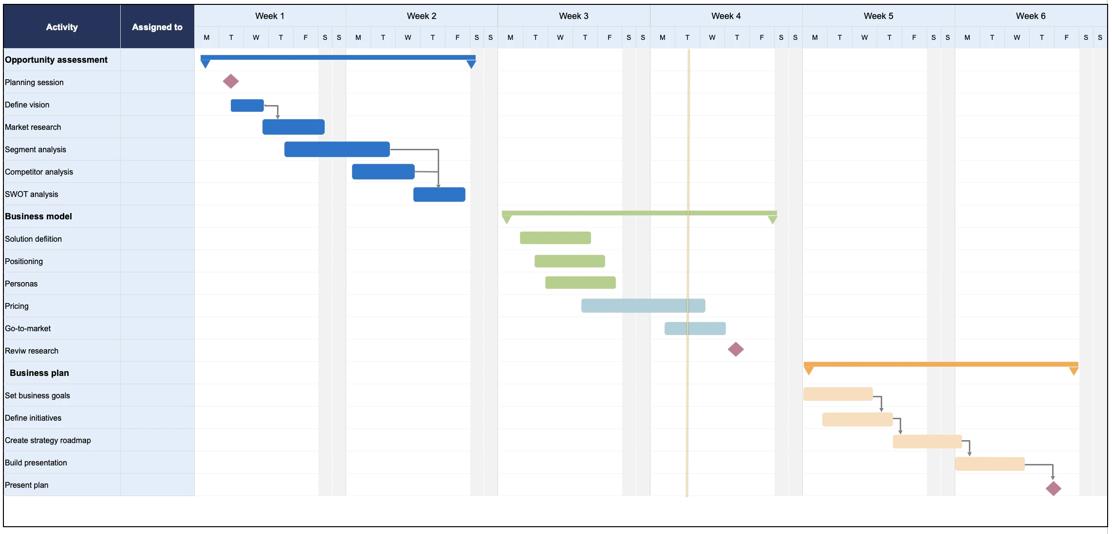 The PowerPoint template below uses a weekly timeline to visualize the important phases and tasks in your strategic planning process. You can also include significant milestones, such as a kickoff session or stakeholder presentation.