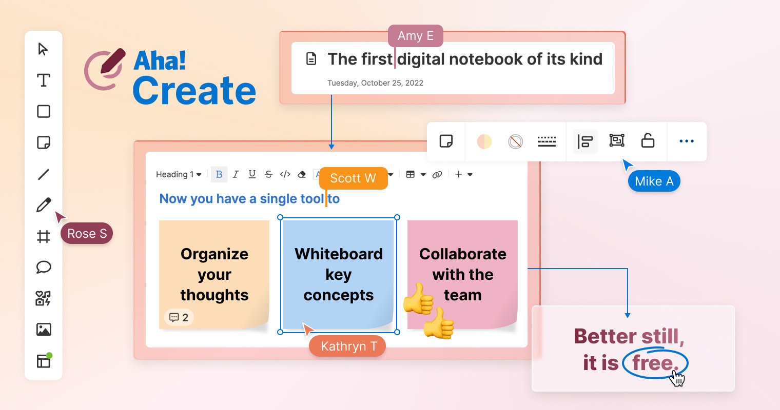 Today, we are excited to make Aha! Create available to everyone — the best way to organize thoughts, whiteboard concepts, and collaborate with the team.